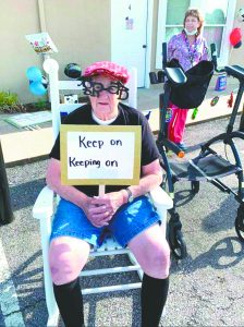 ‘SENIOR’ ADVICE — Leon Mann, a resident at Integrity Park Terrace Assisted Living in South Fulton, holds up a sign with his advice — “Keep on keeping on” — for seniors graduating from high school in the Class of 2020. He was one of 20 residents who held up signs offering words of encouragement or advice as members of the graduating class at South Fulton High School drove through the assisted living facility’s property for a parade Thursday evening. Mann, who wore grad-themed glasses, was flanked by employee Linda Cherry (background) as he enjoyed the procession.