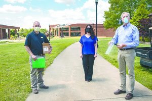 MEETING A NEED — Reelfoot Rural Ministries executive director the Rev. Robert Craig (left) was joined by University of Tennessee at Martin chief information officer Amy Belew and UT Martin alumnus and dentist Dr. Greg Moore in displaying the medical face shields produced by UT Martin. Reelfoot Rural Ministries purchased face masks to use in its dental clinic when it reopens June 2.