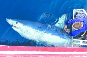 PLAYING TAG — Kesley Gibson, a Martin native and a 2012 graduate of the University of Tennessee at Martin, tags a 12.5-foot female mako, nicknamed “Martie,” off the Scat Cat boat. She is a postdoctoral research associate in the Center for Sportfish Science and Conservation at Texas A&M University-Corpus Christi’s Harte Research Institute for Gulf of Mexico Studies.