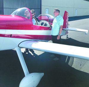 LABOR OF LOVE — Local pastor Tommy Hall (right) watches as pilot Mike Rinker (at front in cockpit) and aviation mechanic Justin Wright (partially hidden) check out his recently-completed personal experimental airplane prior to an initial test flight. Hall spent 12 years building the Van’s RV-8 tandem two-seat single-engine aircraft and, after many hours of work and dedication to the project, received approval for flight from the Federal Aviation Administration in June.