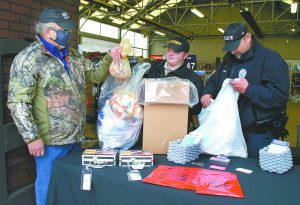 IN THE BAG — Forty pounds of un-used or expired medications were collected Saturday during a DEA National Drug Take Back event held at the Union City Walmart Supercenter’s garden center. Locally, it was a joint effort of the Obion County Prevention Coalition, Obion County Sheriff’s Office, Union City Police Department and Walmart. Among those on hand to help during the four-hour event were (from left) coalition chairman Joe Garner, a retired Union City police chief, who was assisted by sheriff’s deputy Danny Evans and police patrol officer Cpl. Joey Faulkner as they gathered some of the medications collected for safe and proper disposal.