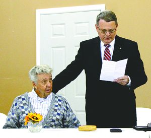 SURPRISE ANNOUNCEMENT — Samburg vice mayor Grant Reed (seated) was surprised Saturday morning during a called meeting of the mayor and board of aldermen when tourism committee chairman Ed Mayberry read aloud a resolution to rename the Samburg City Hall facility The Grant Reed Municipal Building in recognition of his commitment and dedication to the town.