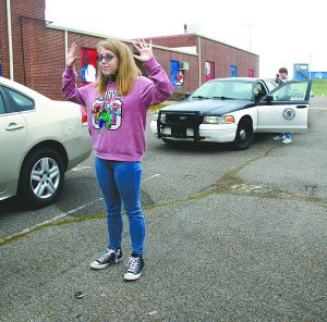 HANDS-ON HANDS-UP — Obion County Central High School senior Grace Harris (left) and junior Mason Hicks, students in one of the criminal justice classes at the school, practice a high-risk traffic stop with the use of props and a retired police patrol car the Town of Troy recently donated to OCCHS and its criminal justice program. Students will be able to use the car for learning experience and to practice for SkillsUSA competition. Plus, criminal justice teacher Heath Cunningham will use it in his travels to the county’s schools in his capacity as systemwide safety coordinator.