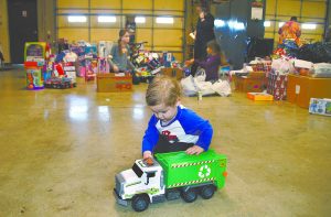 TRUCKING ALONG — Two-year-old Coleson Taylor entertained himself with a toy truck while his mother, Ginny Taylor of Union City, worked alongside other volunteers during Chimes for Charity’s sorting activity Tuesday afternoon at the Obion County school bus garage in Troy’s industrial park. The volunteers worked to sort toys, canned goods and non-perishable food items recently donated to Chimes through local collection efforts in the community. Chimes is in its 86th season of providing food, clothing and toys to less fortunate families across Obion County at Christmas. This year’s program will culminate with the delivery of 300 food baskets to those in need early Thursday. Volunteers gathered at the bus garage at 11 this morning to pack the baskets, with that activity expected to continue into early this evening for anyone wishing to help.