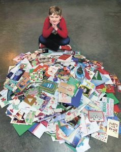 SPECIAL DELIVERY — Landon Matheny, 6-year-old son of Waylon and Maria Matheny of rural Troy, is surrounded by some of the nearly 4,000 Christmas cards he and his family have received since early December. A local woman’s late November request for the community to send cards to the youngster and his family has drawn overwhelming response from not only Obion County, but from across the United States and around the world. Cards and packages have come from all 50 states and from several foreign countries. Landon has been undergoing treatment for a cancerous brain tumor since August 2020.