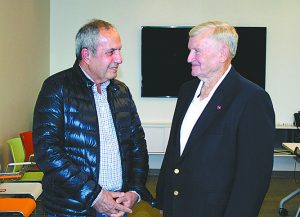 BACK ON TRACK — Darius Mir (left), owner and chief executive officer of MIA Seating in Union City, recently discussed the company’s innovative plan to maximize productivity and bring jobs to the area with Obion County Mayor Benny McGuire. The facility was damaged when a tornado hit the plant on May 4, taking out a large portion of the roof and wall.