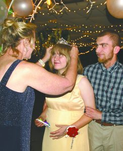 ROYAL TREATMENT — Eighteen-year-old Sarah Crowell (center) of Union City, escorted by her big brother, James Crowell, smiles up at volunteer Julie Huggins of Union City as she is crowned as one of several queens at the conclusion of Friday night’s Kings and Queens Prom at the Refuge Church, which meets at the Obion County Fairgrounds. The church hosts the event annually for people with special needs to give them a full prom experience, complete with dinner, dancing, limousine rides, photos and every participant being crowned a king or queen at night’s end. Sarah and James, a 19-year-old college freshman, are the children of Billy and Colvine Crowell of Union City.