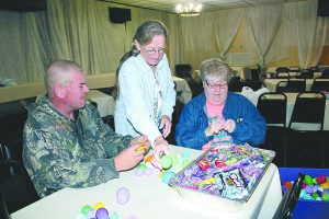 EASTER HELPERS — The Easter Bunny got some help from (from left) Charles Coble, Mary Anna Coble and Sheila Fortner, all of Union City, with placing candy in plastic eggs Wednesday night in preparation for the annual Easter egg hunt at the Jones-Walker Veterans of Foreign Wars Post 4862 on Saturday. The event begins at 2 p.m. for children from birth to 12 years old and will be held rain or shine. In addition to monetary prizes in some of the eggs, there will also be baskets and toys available for those who participate. Following the egg hunt, the VFW will host a spaghetti dinner and cake walk at 5 p.m. The menu includes spaghetti, salad, bread and tea for $10 a plate. The cake walk will start after dinner, with tickets being a quarter per walk. The public is invited to attend.