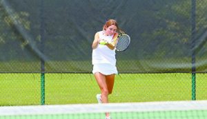 TWICE AS NICE — Union City High school sophomore Molly Kizer uses a two-handed backhand shot during her singles match against Madison Academic’s Megan Hicks in the sectional team round of postseason play Tuesday in Jackson. Kizer was involved in two of the Lady Tornadoes’ four wins, taking a 6-2, 6-3 singles victory and then joining with Gracyn Callicott for an 8-3 triumph at the No. 2 doubles to clinch the 4-3 team verdict. UC will play Unicoi County 3 p.m. Tuesday in the semifinals of the TSSAA State Team Tournament in Murfreesboro. (See related coverage, Page 10.)