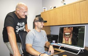 SPECIAL SMILE — Brad Warner (left) of Rives and his son, Bryce Warner, an Obion Countian who is in his final year of dental school, scroll through before and after photos of the smile makeover Bryce recently gave his dad. The amazing “after” photo is on the screen.