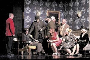 NEED A CLUE? — It’s a question of murder, but who did it, where did they do it and with what did they do it are the real questions to be asked. Wadsworth (Sel Miller, seated left), the butler in Masquerade Theatre’s production of “Clue: On Stage,” may think he is the victim after a crew summoned to the Boddy Manor is provided with weapons and told he is the reason Mr. Boddy (Brian Hughes, standing left) is doubling what they owe him in his bridery scheme against each of them. About ready to strike are (seated, continuing second from left) Miss Scarlet (Mollie Scott), Mrs. Peacock (Sandy Tolar), Mrs. White (Marîa Sweatt), (standing, continuing second from left) Professor Plum (Dustin Cummins), Mr. Green (Quentin Brown) and Colonel Mustard (Dr. Kirk Stone). The shows are being staged at the Capitol Theatre in downtown Union City Friday through Sunday and Oct. 21-23, with Friday and Saturday shows at 7 p.m. and Sunday shows at 2 p.m. Tickets are $10 each and available online at https://ticketpeak.co/ucmasqueradetheatre/events and at the theater box office 30 minutes prior to each performance. The show is rated PG for mild language and adult humor.