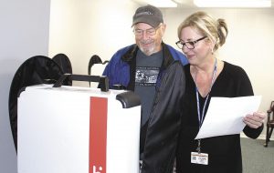 EXERCISING HIS RIGHT — Early voting for the Nov. 8 election kicked off Wednesday morning at the Obion County Election Commission office, where Ron Akin of Union City was helped by administrator of elections Leigh Schlager as he prepared to cast his ballot. Several municipal elections are on the ballot for Obion Countians, in addition to the state and federal general election races and several constitutional amendments and Senate joint resolutions. Early voting continues through Nov. 3, during which time all of the county’s registered voters may cast their ballots at the election office at 308 Bill Burnett Circle in Union City, adjacent to the courthouse. The office is open Mondays through Fridays from 8:30 a.m.-4:30 p.m., as well as Saturdays from 9 a.m.-noon during the early voting period. Valid photo identification is required.