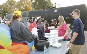 COMMUNITY FEED — Tyson Foods hosted its annual Community Feed event Friday at the Obion County Farmers Market Pavilion following trick-or-treating activities in downtown Union City. Within 15 minutes of the posted distribution time of 5 p.m., more than 1,300 meals of a chicken, chips, cookies and water had been distributed. Among those assisting in the effort were Tyson representatives (from left) Ashley Callahan of Rives, Shelby Morphis of South Fulton and Jared Lynch of Mayfield, Ky. When all the meals were gone, Ms. Callahan then walked the line to give candy to the children. This event is part of Tyson Foods’ continued commitment to providing local families with nutritious, quality food and serving communities where its team members live, work and play, a Tyson official said.