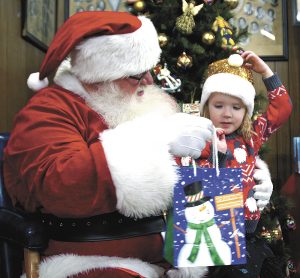 HATS OFF TO SANTA — A visit to Hornbeak led to seeing Santa Claus for 3-year-old Willie Ann Fish of Humboldt, who stopped by to talk with the jolly old elf Saturday afternoon during the town’s free Visit with Santa event at Hornbeak City Hall. She compared her gold hat with Santa’s red one as she received a treat bag with candy and a gift card from the town. Children and their families also enjoyed refreshments of hot chocolate and cookies with the help of the local Woodmen of the World chapter.