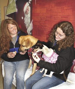 SANTA ‘PAWS’ — Santa Claus appeared to peek around a Christmas backdrop while animal control officer Alyssa Webb (left) held Elfy and fellow ACO Olivia Batts held Coco as the dogs enjoyed pup cups of whipped cream topped with dog treats Wednesday morning at the Union City Department of Animal Control building at 1415 North Fifth St. Both dogs were picked up after being abandoned. Local residents were invited to drop by the animal control office Wednesday and today from 9 a.m. to 3 p.m. to take pictures with their own pets in front of the holiday backdrop. Donations will be accepted, but are not required.