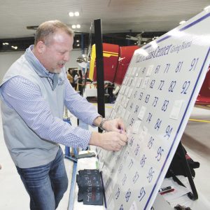 FILLING THE BOARD — Donnie Walton of Commercial Bank worked to help fill the giving board at The Gathering, a fundraising event for the Carl Perkins Center for the Prevention of Child Abuse, held Saturday at Full Stop Aviation, located at Everett-Stewart Regional Airport. The center services clients in Obion and Weakley counties.
