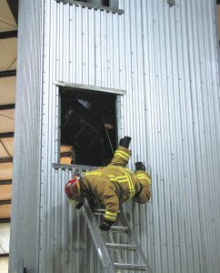 SIDEWINDER — Union City firefighter William Jackson twisted around to right himself on a ladder after coming out of a window head first Thursday during emergency egress bailout training hosted by the Union City Fire Department. The training was done with the aid of a portable tower and personnel from the Tennessee Fire Service and Codes Enforcement Academy (TFACA), giving the department tower training credit for its ISO rating, which reflects preparedness. With bad weather in the forecast, all three UCFD shifts trained at an indoor facility courtesy of Nutrien. At week’s end, firefighters from several departments around Obion County also did the training. The three-story portable tower has been in use about five years and this was its first use locally.