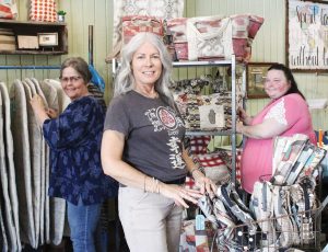 HELPING WOMEN RECOVER — LeEllen Smith (center) was recently joined by Lisa Salazar (left) and Kayla Wilson in readying the travel gear they make and have on display for sale at OUTsideIN in Troy. Mrs. Smith, founder of the social enterprise, has announced she is expanding her effort to help marginalized women by opening recovery housing in the home where she and husband, Jimmy, raised their children. A fundraising effort is currently under way. Money donated and pledged through May 8 will be matched by the Latimer Foundation. For more information, visit The OUTside INN Matching Fundraiser on Facebook or email Mrs. Smith at leellen@outsideinworks.com.