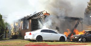 HOME & CARS BURN — Firefighters pulled a hose early Tuesday as they entered a burning home at 512 North Dobbins St. in Union City, north of East College Street, where two cars beside a carport also caught fire. The Union City Fire Department was dispatched to the blaze at 8:12 a.m., arriving to find flames already coming through the roof of the rental house. Union City Fire Chief Karl Ullrich said two people who were home at the time were able to safely escape, with one sustaining minor injury. He said the fire started in the wall between the house and the carport, with the cars catching fire as a result of the structure fire. Fire officials have an idea of the origin, but not the cause, and have requested a fire loss consultant from the state fire marshal’s office to help determine cause. No foul play is currently suspected. South Fulton and Rives fire departments responded via auto aid to assist the UCFD, which had a good turnout of personnel due to the alarm coming in shortly after 8 a.m. shift change. The fire was quickly knocked down and reported under control at 8:38 a.m. Firefighters remained on the scene until shortly after 10 a.m. doing overhaul, including extinguishing hot spots and salvaging some of the family’s belongings. Ullrich said the home was “very heavily damaged.”