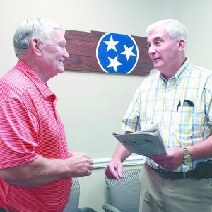 TALKING TRANSITION — Obion County mayor-elect Steve Carr (right) talked with longtime Obion County Mayor Benny McGuire after Monday morning’s county budget committee meeting. Carr, a Republican, won election to the mayor’s position in Thursday’s Obion County General Election by besting four other candidates who all ran as Independents. Over the next three weeks, he…