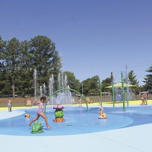 SPLASH PAD OPENS — RaChelle Tharpes, 8-year-old daughter of Charity Pinkston and DeAnte Tharpes, both of Mayfield, Ky., leaped over a water-spitting frog at Union City’s new splash pad on Sunswept Drive Wednesday morning. She was in Union City visiting her cousin, 2-year-old Kayzlee Long (not pictured), daughter of Casidy Connell of Union City and…